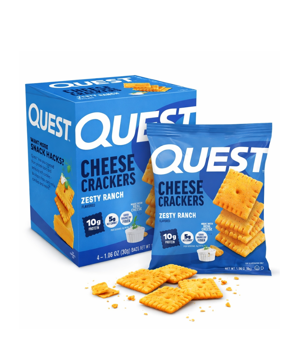 Les innovateurs de Quest l’ont encore fait ! Voici les nouveaux craquelins au fromage Quest®. Ces craquelins ont un goût savoureux de fromage que vous aimez, en plus de toute la saveur et des protéines. Fabriqués avec du vrai fromage, les craquelins Quest sont une collation irrésistible qui vous fera craquer toute la journée.