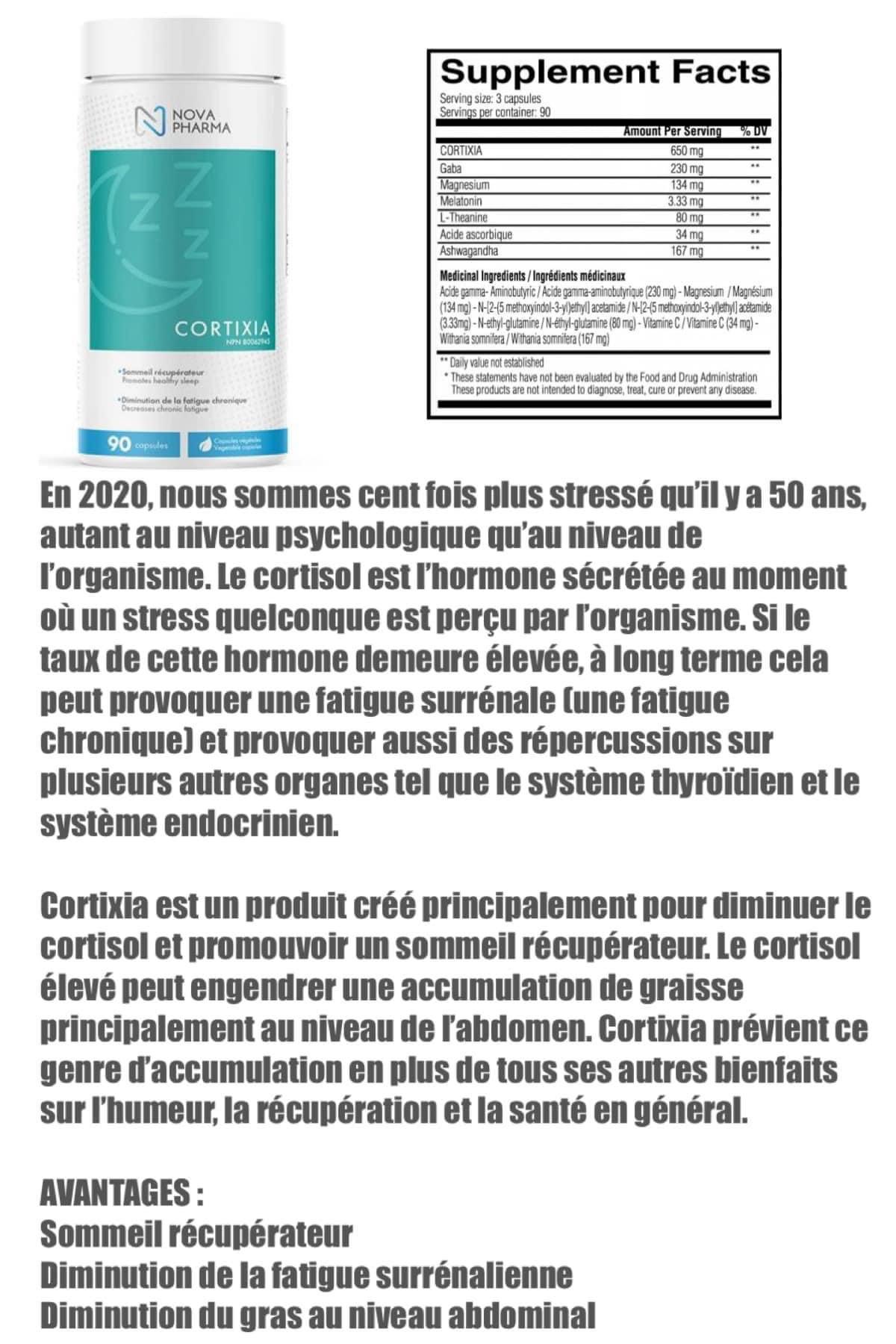 Notre complexe Cortixia est un produit destiné à diminuer le cortisol dans le corps et à promouvoir un sommeil récupérateur. En réduisant le taux de cortisol, Cortixia protège votre système et prévient la prise de poids liée au stress. De plus, le Corixia peut avoir un impact positif sur l’humeur, la récupération et la santé en général. Pour de plus amples informations sur ce produit, communiquez avec notre équipe de professionnels. Elle se fera un plaisir de vous informer.